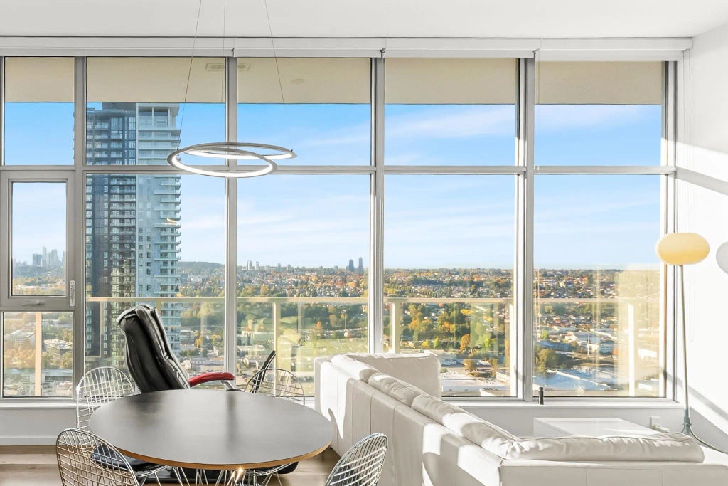 Stunning southwest facing penthouse at Triomphe! With 1210 sqft of interior space, 10ft ceiling, and air con, this 3 bedroom, 2 bath home offers modern comfort and timeless style. Enjoy unobstructed city and water views from both the living room and wraparound balcony, spanning Burnaby, Downtown Vancouver, Lions Gate Bridge, and Burrard Inlet. Open concept layout with floor to ceiling windows bring in abundant natural light. Amenities includes concierge, gym, lounge, music and meeting rooms, outdoor pool and hot tub. Steps from Gilmore SkyTrain Station and surrounded by vibrant restaurants, cafés, and shops, this penthouse offers unmatched urban convenience. 3 side-by-side parking stalls and 2 storage lockers - a rare find in luxury living! OH Sun Oct 18 2-4pm