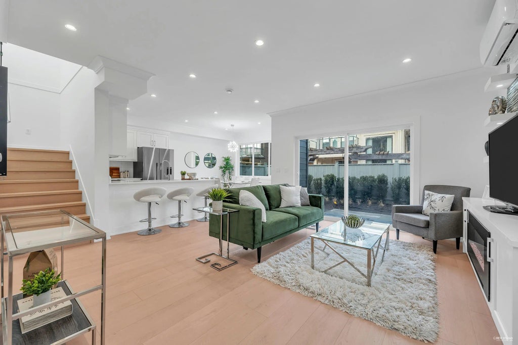 This modern 2-story townhome boasts high end finishes with an abundance of natural light and a functional open floorplan. The gourmet kitchen features SS appliances, quartz countertops, and work island seating. Adjacent to the kitchen you'll find a spacious dining room. The cozy living area features built-in entertainment cabinetry, custom under lit shelving with modern electric fireplace and contemporary wide plank laminate flooring. Master bedroom offers a spa-like Ensuite. Complete with AC, HRV, Heat Pump, plus electric baseboard. DOUBLE car garage with EV outlet and more. Convenient central location close to both school levels, South Arm Community Center offering Pickleball & Tennis Courts, outdoor pool, and Athletic fields.