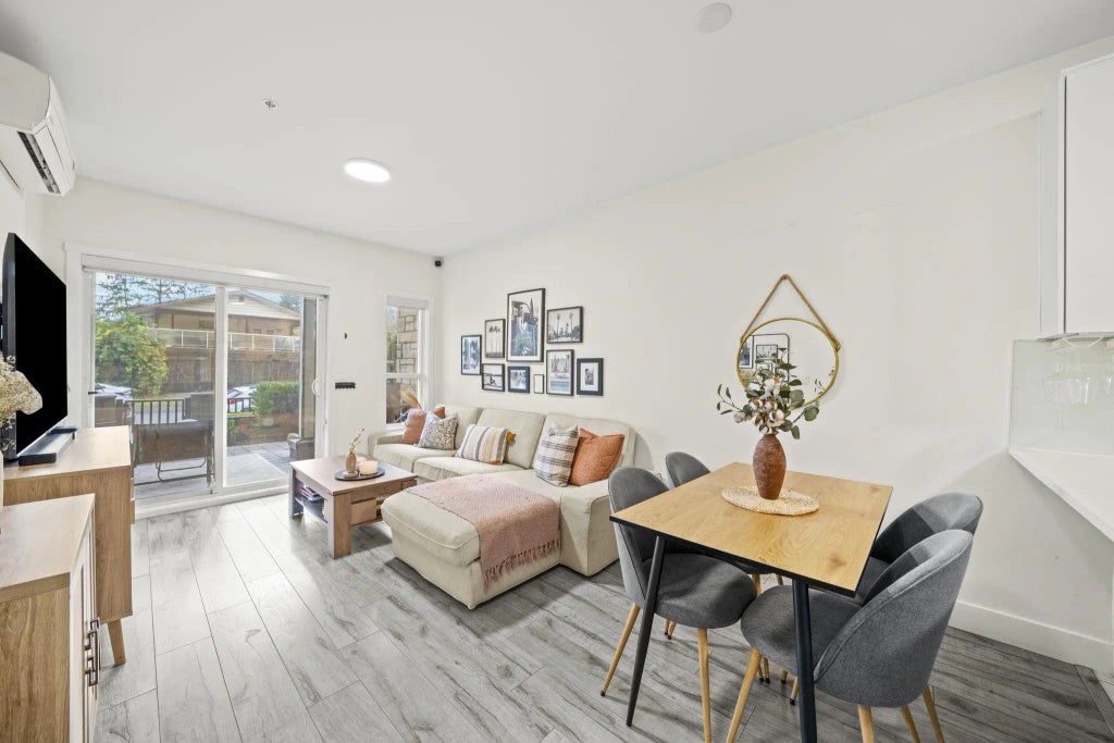 Welcome to The 222, a beautifully maintained and modern 1-bedroom, 1-bathroom condo in the heart of Maple Ridge. This bright and open-concept home features contemporary finishes throughout, including quartz countertops, stainless steel appliances, and modern cabinetry. Stay comfortable year-round with built-in air conditioning. Spacious living and dining area flows seamlessly to your private ground-level patio, perfect for morning coffee or relaxing outdoors. The large bedroom offers ample closet space, and the bathroom showcases elegant tile work and modern fixtures. In-suite laundry, secure underground parking, and storage locker. Conveniently located near shopping, schools, transit, and parks.